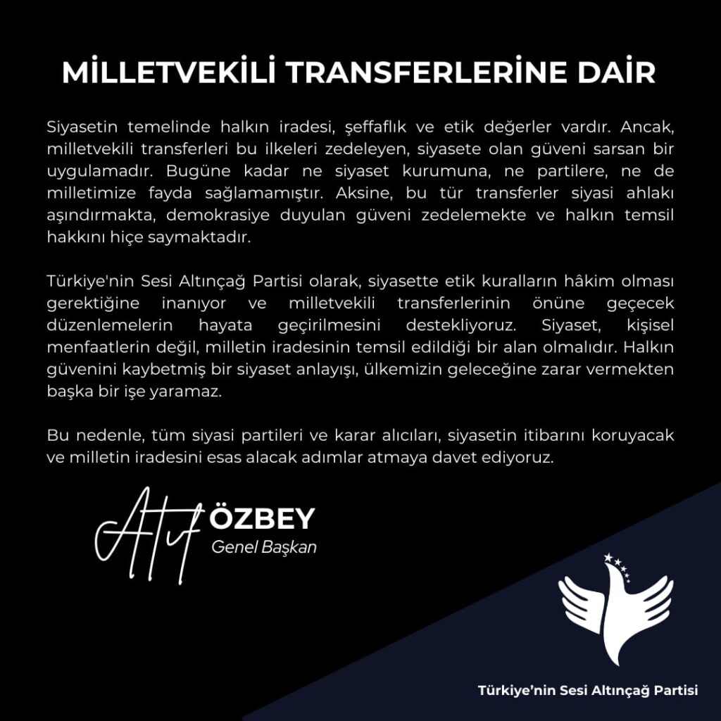 Genel Başkanımız Atıf Özbey, son dönemdeki milletvekili transferlerini eleştirerek “Bu tür transferler siyasi ahlakı aşındırmakta, demokrasiye duyulan güveni zedelemekte ve…